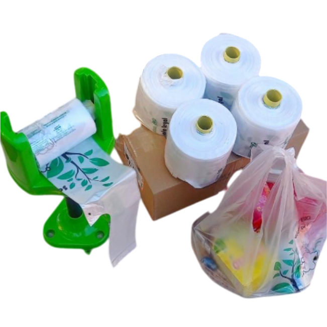 Sacola Alça Camiseta 38×50 Biodegradável em bobinas picotadas fundo reto transparente.